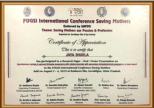 • Presented poster on spontaneous rupture in second trimester pregnancy with uterine anomaly in FOGSI (International Conference Saving Mothers in 2019).