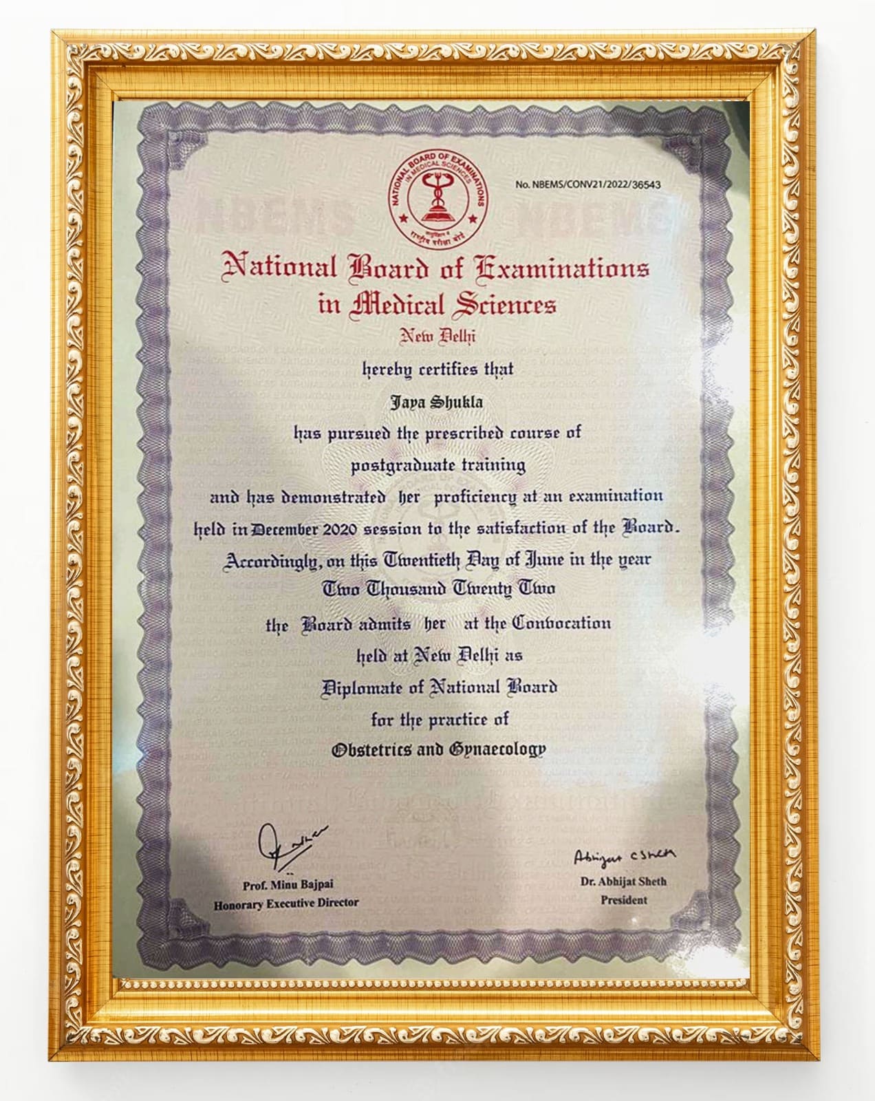 M.B.B.S, M.S, DNB (obstetric & Gynecologist) FMAS (Fellowship in Minimal Access Surgery), Gold Medalist.